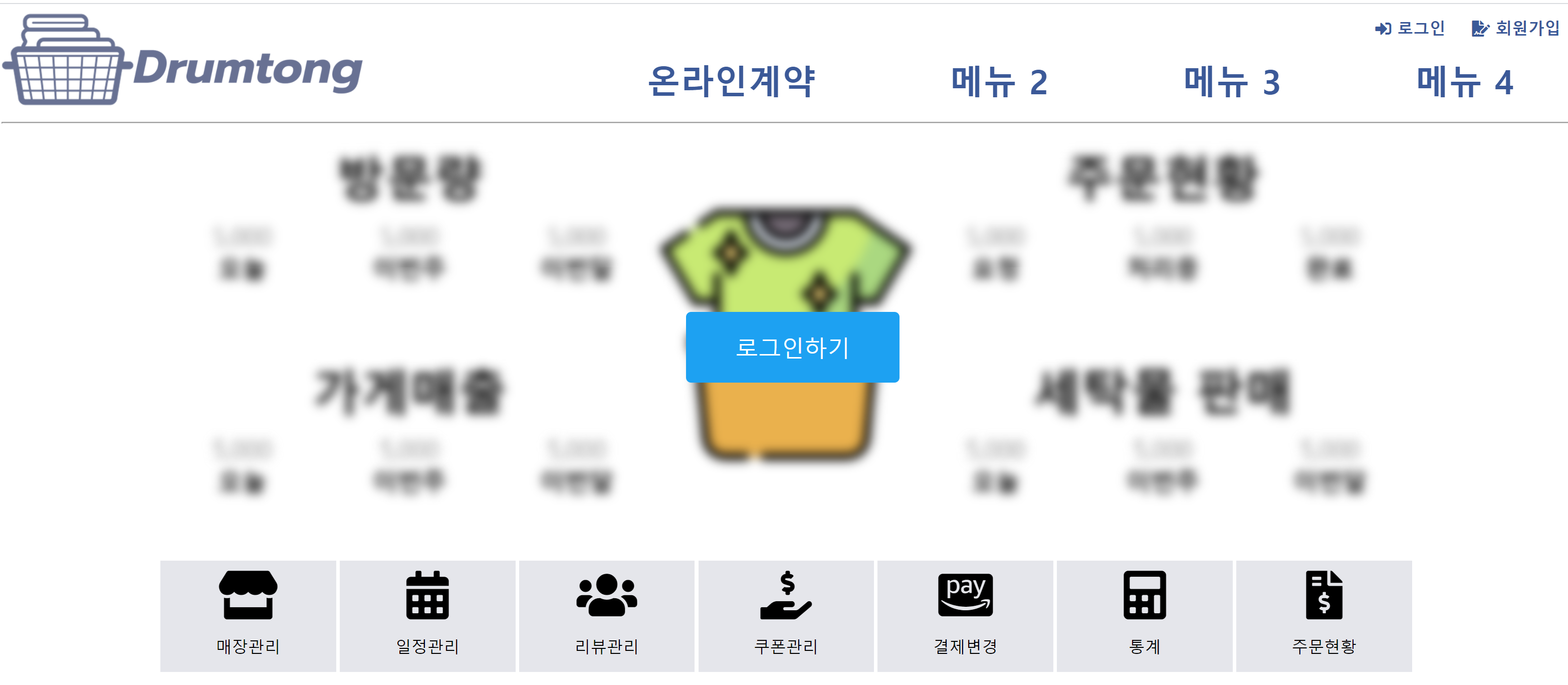 고객리뷰, 온라인계약, 결제수단, 수입통계, 주문현황 관리 기능을 구현함